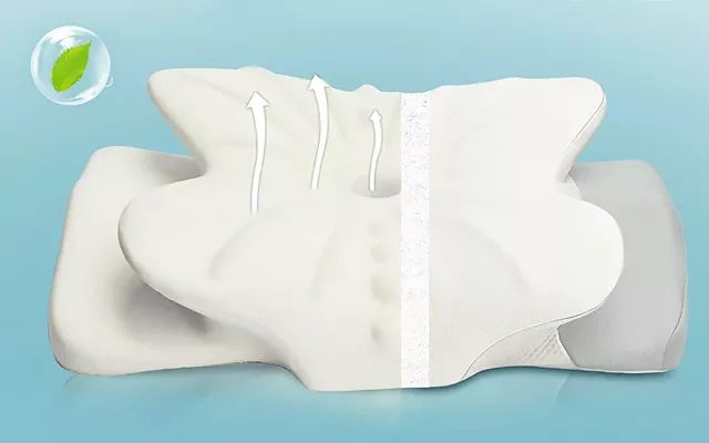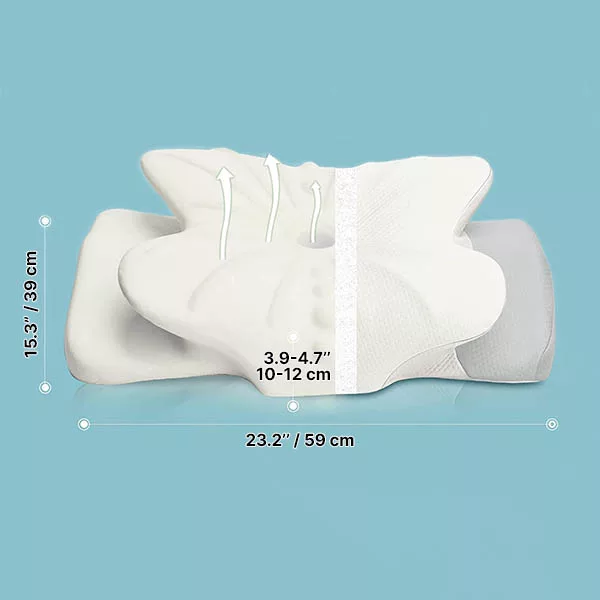 Our memory foam pillow is thoughtfully designed with a central cavity to cradle your head. It offers two height contours to accommodate various neck sizes. These attributes promote the correct position of your cervical spine, removing muscle tension and relieving discomfort.