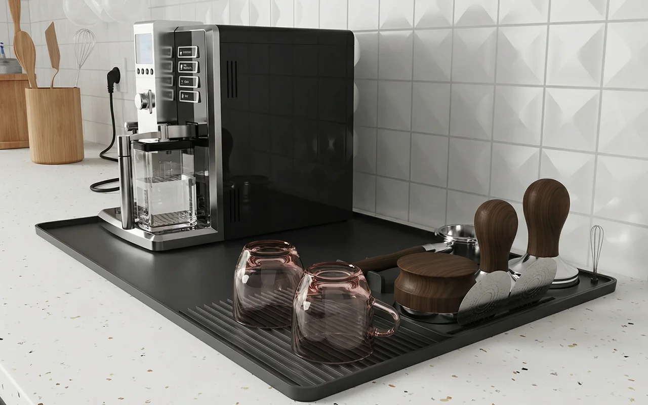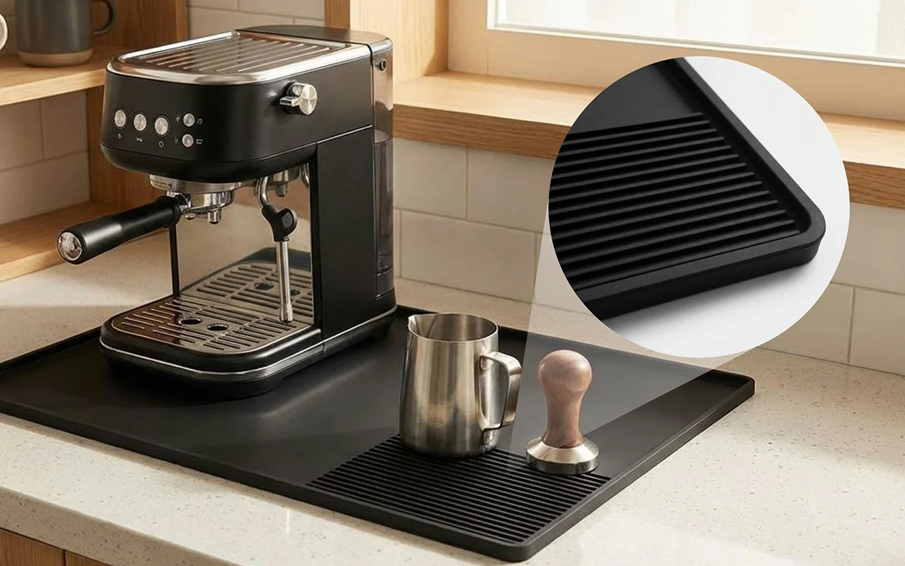 Nygex coffee mat holds tampers, filters, and jugs securely beside machines. Dedicated grooves keep accessories steady, so drink preparation feels smooth every time.