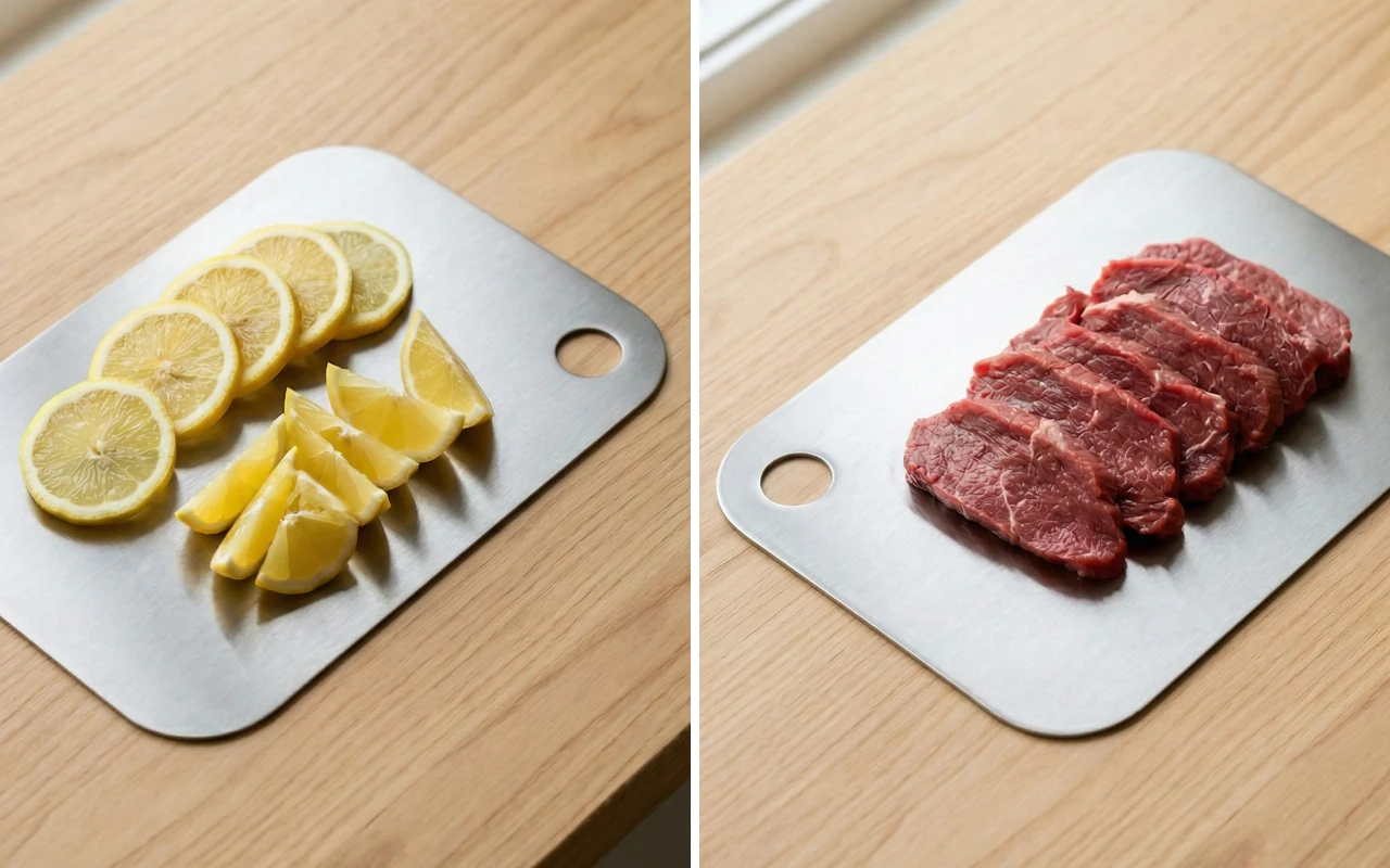 Nygex steel board transforms everyday cooking into calm confidence. Separate sides handle meat, produce, dough or snacks safely. Solid thickness resists bending under heavy chopping pressure. Smooth surface rinses clean quickly, saving precious evening minutes.