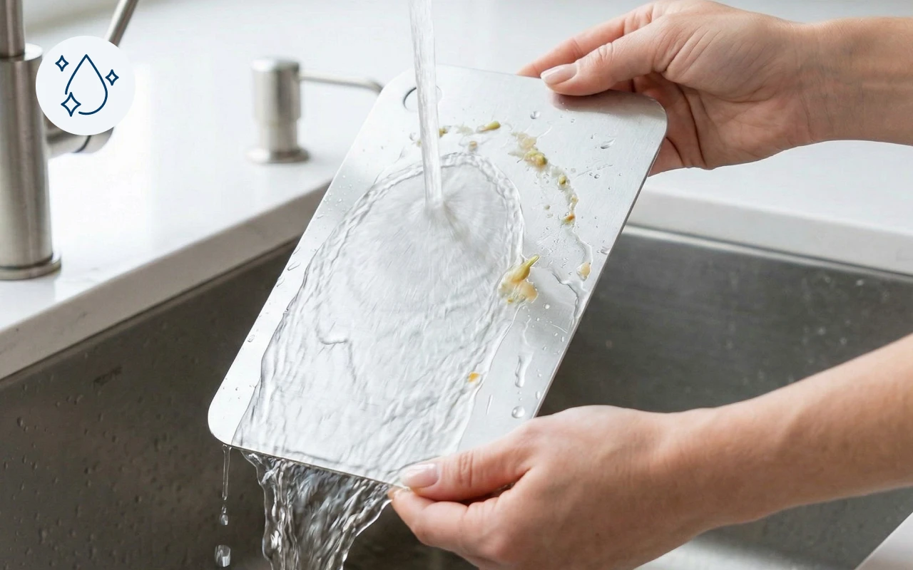Non‑porous metal sheds juices quickly using only running water. Dry surface avoids lingering smells, keeping cupboards pleasantly fresh.