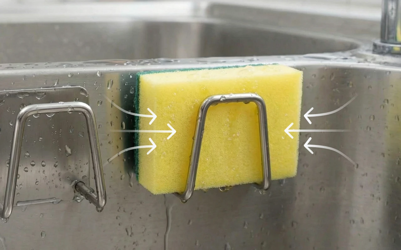 Nygex sponge bracket gathers scrubbers neatly instead of cluttering corners. Every cleaner has a clear resting place, saving time searching.